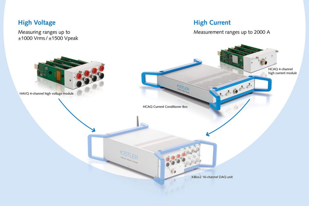 The platform also includes a 4-channel high-voltage module with electrical isolation and a measurement range up to ±1000 Vrms / ±1500 Vpeak, with safety ratings of 1000 V CAT II / 600 V CAT III. A separate 4-channel high-current module supports current measurements up to 2000 A via a Current Conditioner Box and works with external zero-flux current transducers. Kistler says the system can handle DC and AC measurement, high- and low-voltage analysis, energy-management-system testing, and synchronized electric-plus-mechanical power analysis using speed and torque inputs.