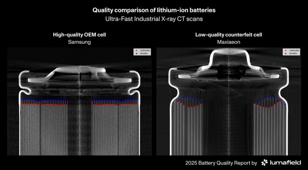 The research evaluated more than a hundred 18650 lithium-ion battery cells from each of ten brands, using industrial X-ray CT scans from Lumafield’s CT scanner and Battery Analysis Module. The results indicated a wide gap in quality between brand-name batteries and cheap cells that are widely available through online marketplaces.